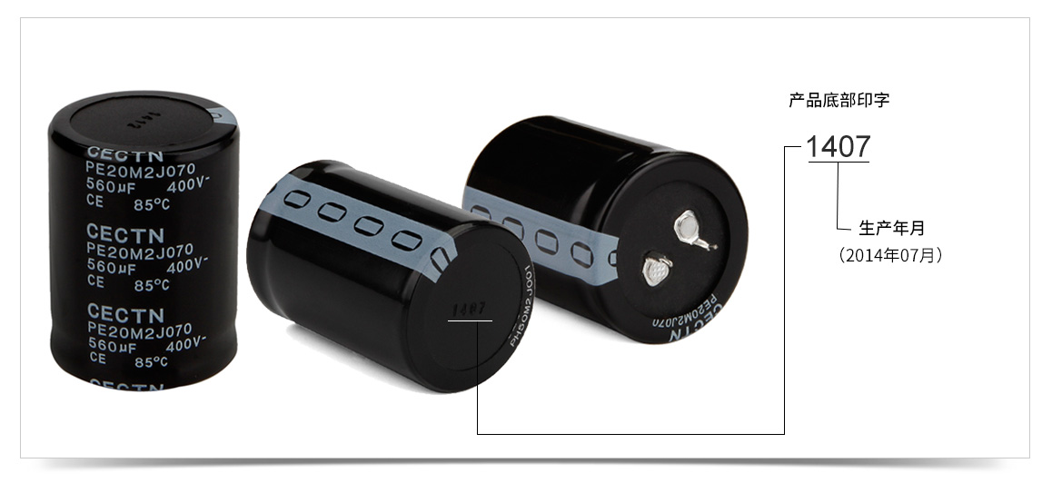 ? ? ? ? 牛角型电解电容底部印字信息为4位数组成,代表着该产品的生产年月,上图所示的1412即表示该产品为2014年12月所生产。