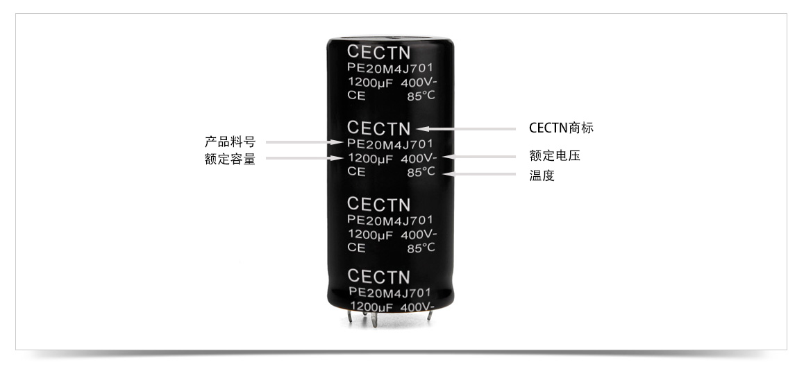 ? ? ? ? CECTN电解电容印字信息中包含了牛角型电解电容的电压、容量、温度、寿命、焊针数量型号等众多信息,详细了解请点击进入《牛角型电解电容料号说明》页面。
