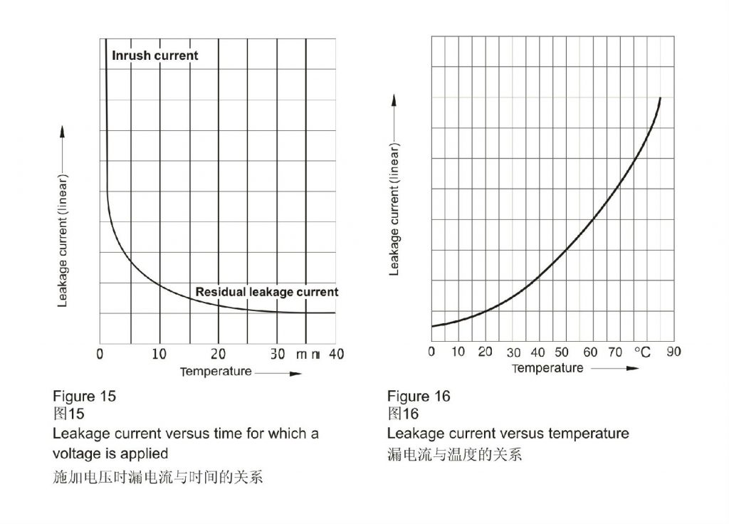 如图15所示,在电压加载至铝电解电容器的前几分钟内,有一股很强的漏电流流过,特别是在长时间储存期间未施加过电压的情况下。在连续工作期间,漏电流会减小,直至几乎恒定的“稳态”值。