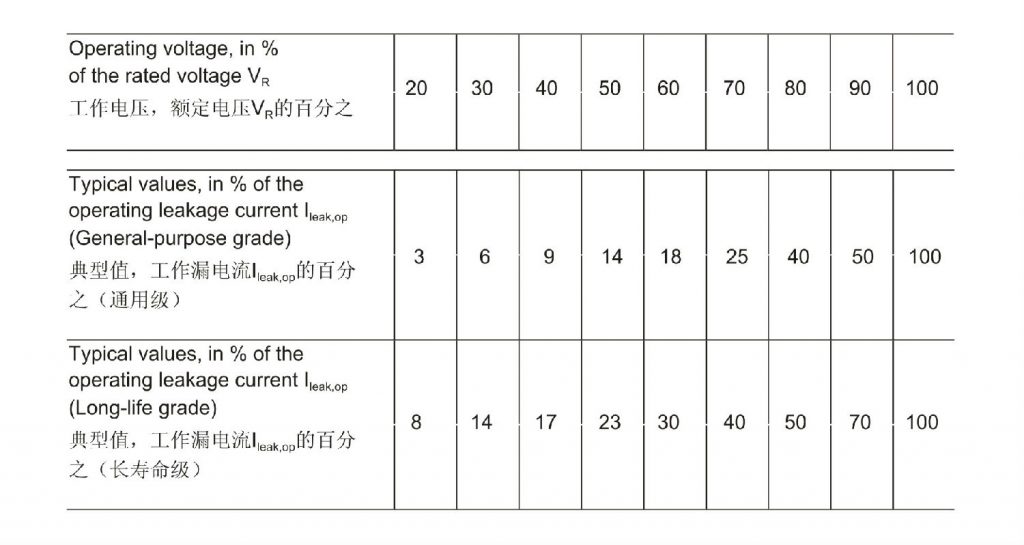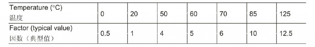 20℃温度条件下取得的结果必须乘以以下因数,以取得通用和长寿命电容器工作漏电流的温度特性。