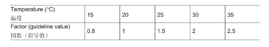 在15℃~35℃之间,均可实施漏电流的验收试验。然后,容许限值应乘以以下转换因数,参考20℃时的值:
